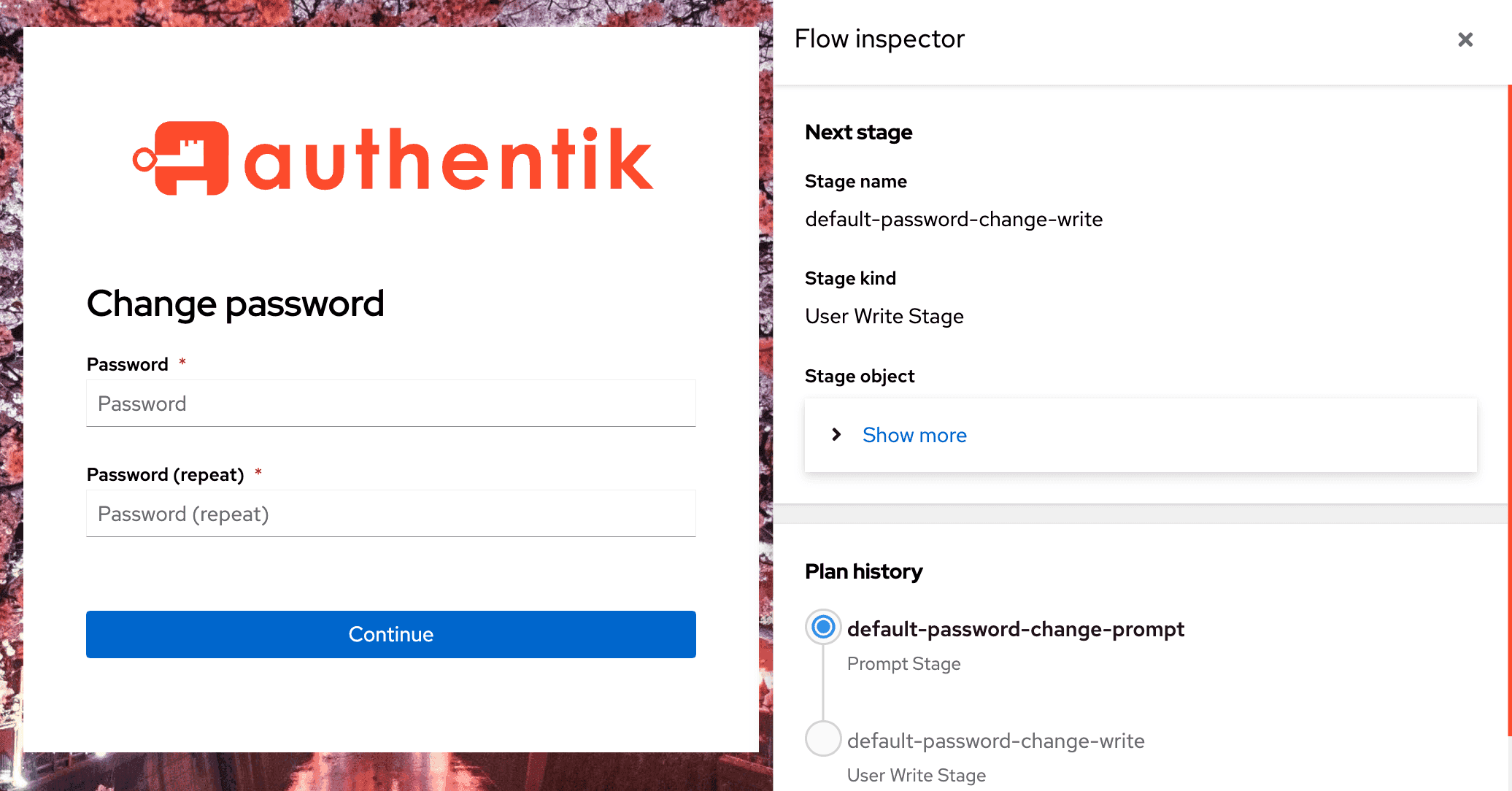 As shown in the screenshot below, the flow inspector displays next to the selected flow (in this case, "Change Password"), with information about that specific flow and flow context.